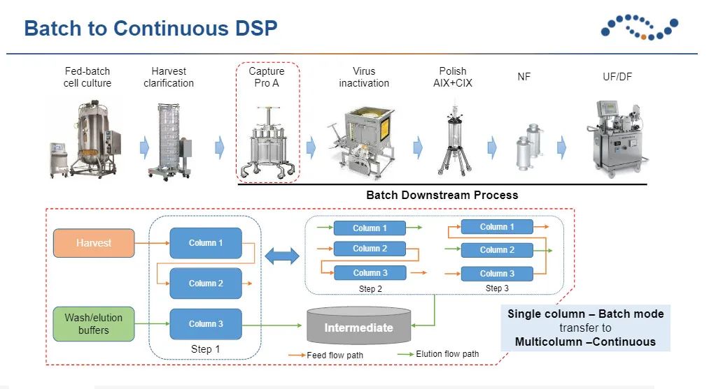因應細胞培養(yǎng)表達量大幅提升后而對下游純化所帶來的壓力, 漢騰生物以親和多柱層析的先進技術來提高填料使用效率。由于單柱親和柱會有樣品流穿的問題, 因此填料的使用效率往往都只有40%以下, 而多柱聯(lián)用可把填料的使用效率提升至90%以上, 進而顯著的降低填料使用量。與傳統(tǒng)的批次純化方式相比, 多柱連續(xù)層析技術可讓填料使用量減少高達80%。