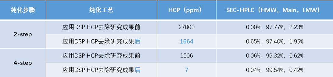 無論采用2步層析工藝抑或4步層析工藝,應(yīng)用DSP關(guān)于HCP去除的研究成果后,此項目產(chǎn)品中的HCP殘留均大幅下降,SEC純度保持不變。有效清除了工藝殘留雜質(zhì)(HCP 低于10ppm;對比已上市同類別產(chǎn)品的900ppm有顯著下降)。