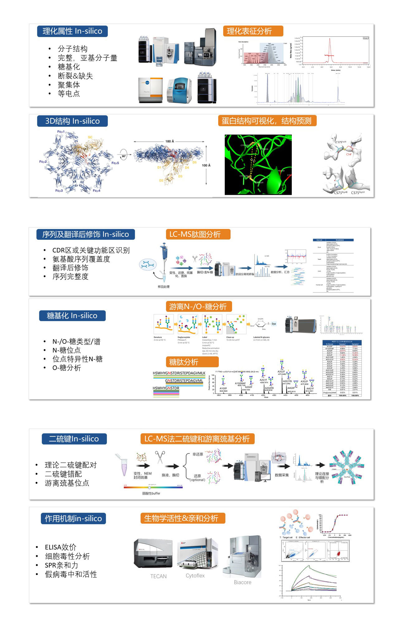 基于序列分析和3D空間結(jié)構(gòu)測(cè)量,能夠獲得蛋白分子量、等電點(diǎn)、消光系數(shù)、二硫鍵、游離巰基、糖基化等信息,進(jìn)一步對(duì)潛在風(fēng)險(xiǎn)翻譯后修飾、分子完整性、聚集性、疏水性等屬性進(jìn)行預(yù)測(cè)。3D可視化能夠加深對(duì)功能位點(diǎn)和作用機(jī)制的深刻理解,結(jié)合平臺(tái)經(jīng)驗(yàn),進(jìn)行風(fēng)險(xiǎn)識(shí)別和應(yīng)對(duì)策略評(píng)估,此外結(jié)構(gòu)和分子背景的全面科學(xué)理解,對(duì)上下游工藝,分析方法,制劑開發(fā)能提供有力參考。